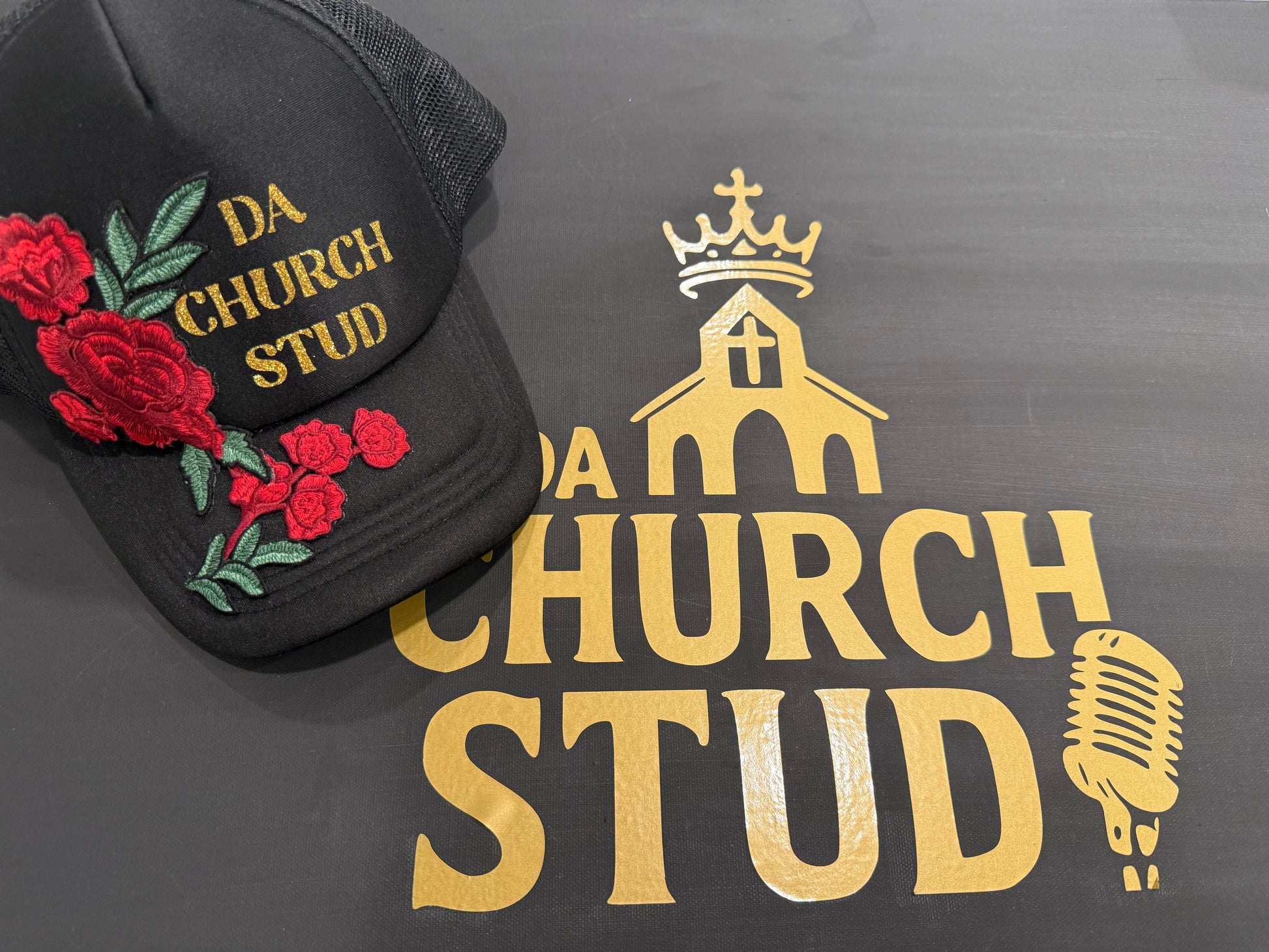 Bold faith with a touch of elegance. The Floral Crown trucker combines Da Church Stud®’s gold embroidery with rose detailing — a nod to strength, beauty, and divine growth.