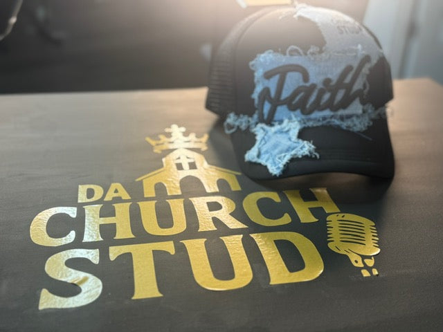 Tested, torn, but never broken. The Faith trucker is raw, with denim patchwork detailing across the crown and bold black script. Built for those who carry scars but still stand firm.