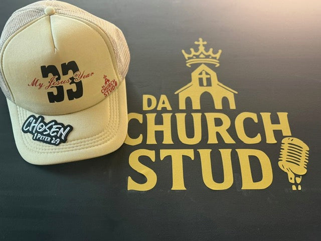 Step into your Jesus Year with confidence. The two-tone cream/black trucker pairs “33” with the Chosen mark — a wearable testimony of purpose and discipline.